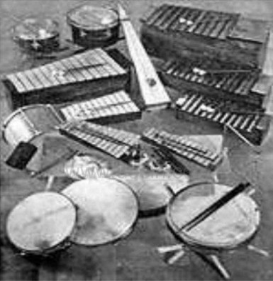 1) 皮革类(鼓类):手鼓、铃鼓、大小军鼓、大小堂鼓、大鼓、架子鼓、排鼓、定音鼓