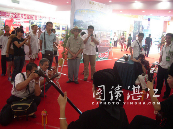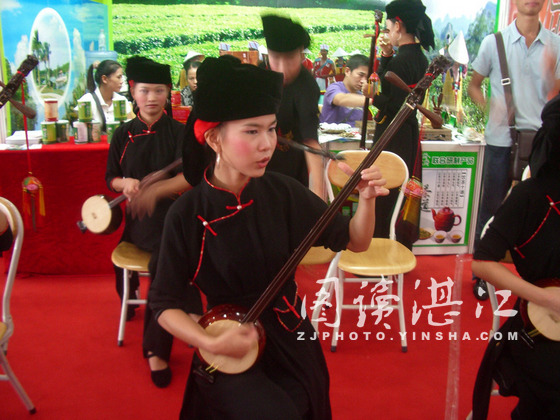 记得央视播出时,壮族姑娘们边弹琴、边唱歌、边跳舞,歌声虽不激昂却声声委婉悠扬,每位表演者脚下那一串铜铃伴随着清脆的琴声像天籁之音叩人心扉,令笔者颇感这种少数民族的表演独具一格,也使笔者深深记往了它,同时渴望有机会看到它的现场表演,而此次能在“家门口”亲眼看到它的表演,还得感谢市里举办的“茶博会”,同时感谢南亚热带植物园与广西农垦茶叶研究所,为推介其共同研发的全国名优茶评比一等奖产品“金萱茶”,他们不仅参展而且邀请了“天琴”表演团体来我们湛江助兴演出。