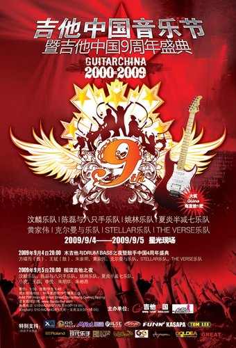 经过筹备,吉他中国音乐节暨吉他中国9周年盛典将于2009年9月4日~5日两天在星光现场上演!往年的周年盛典都引得全国各地的GCer莅临,为了让大家更有节日的感觉,今年的周年盛典扩充为吉他音乐节,以摇滚电吉他为核心,以木吉他、BASS为辅,以电声乐队鼓为基础,形成一个全方位的乐手节!这也是吉他中国首次以“吉他中国音乐节”的形式和称呼,举办连续的音乐会,我们将为支持GC,喜欢GC的琴友们奉献一个真正的吉他的节日!