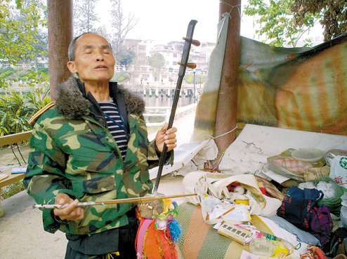 至今伴随着黄明忠的只有一把二胡和一支竖笛。黄明忠说,他自小喜欢音乐,很多乐器无师自通。除了二胡和竖笛,他还会手风琴、快板、吉他、笛子、唢呐等等乐器。他说他的第一把二胡是他自己制作的,用竹子做琴筒,硬木做琴杆,用青蛙皮做琴皮。在凉亭,黄明忠陶醉地用二胡给记者拉了一些曲子。他说到凉亭歇息的游人可以听他拉二胡,不少居民还是他的粉丝。