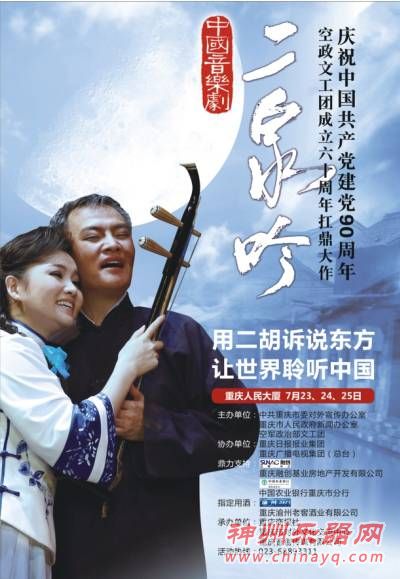 作为空政文工团建团60周年,历时三年、耗资千万倾力打造的中国音乐剧《二泉吟》,将在建党九十周年之际,作为重点献礼剧目登陆重庆大剧院。本次活动由中国重庆市委对外宣传办公室、重庆市人民政府新闻办公室、空军政治部文工团主办,重庆日报报业集团、重庆广播电视集团(总台)协办,重庆融创基业房地产开发公司、重庆农业银行重庆市分行鼎力支持,旨在建党90年之际,为重庆市民带来一场红色视觉听觉盛宴。