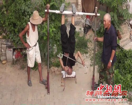 河南宁陵县阳驿乡81岁退休教师梁祖同,不仅能倒挂空中演奏二胡,还能写字画画,目睹其绝活者无不啧啧称叹。
