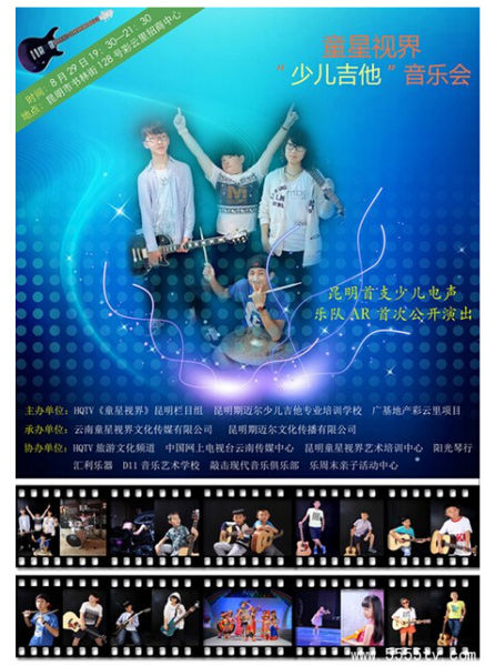 随着现代音乐在中国的发展,少儿吉他教育越来越普及,更多的家长选择让孩子学习吉他等现代音乐进行综合素质能力的加强和提高,吉他学习热潮逐渐低龄化。为了更好推动昆明少儿吉他教育的普及,为小吉他手们提供一个梦想起航、展现自我的舞台!由HQTV《童星视界》昆明栏目组、昆明期迈尔少儿吉他专业培训学校、广基地产彩云里项目共同主办;HQTV旅游文化频道、中国网上电视台云南传媒中心、昆明童星视界艺术培训中心、阳光琴行、汇利乐器、D11音乐艺术、敲击现代音乐俱乐部、乐周末亲子活动中心等单位协办;云南童星视界文化传媒有限公司承办的2015童星视界“少儿吉他”音乐会将于8月29日在广基彩云里招商中心(地址:昆明市书林街128号)举办。