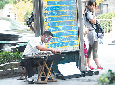 昨日,在南京太平北路的公交站台上,一位民间古琴爱好者将自己的脸彩绘成“孙悟空”的脸后,专心致志地弹奏,吸引了许动市民的眼球。