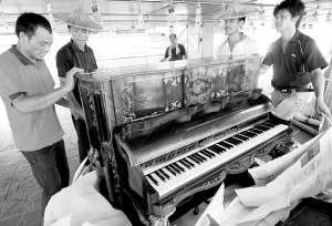 这些精美的古琴在搬运过程中享受很高待遇。这33架琴被分拆成82件包装,用白色防水泡沫纸严密包裹,整齐地陈列在船舱内,工人们正小心翼翼地进行卸载工作,并用板车一次次将琴的部件运往鼓浪屿风琴博物馆和钢琴博物馆。