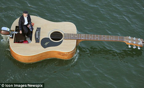 澳大利亚一名写词并演唱的歌手日前乘坐吉他形状的小船成功的穿越了悉尼湾。该歌手此举是为了自己即将发行的单曲上市进行宣传。