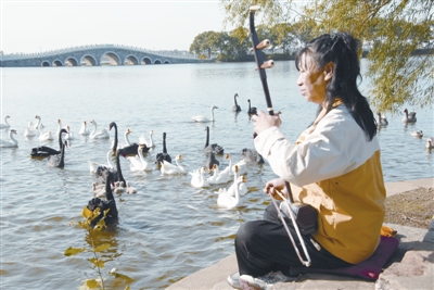 王女士说,自两年前家搬到动物园附近,她开始进入园中天鹅湖边学习拉二胡。刚开始,湖中的鸟类对二胡乐音没有兴趣,但半年以后,只要她背着二胡往湖边一站,马上会有百余只水禽过来“欣赏”。
