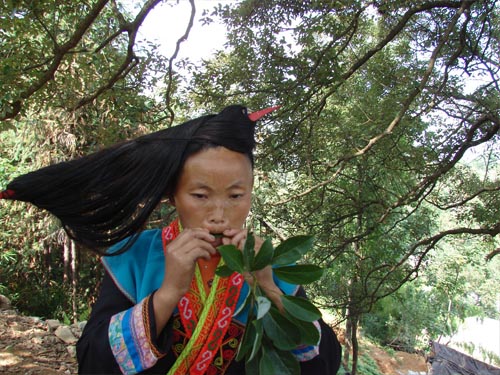 木叶,也是苗家富有古风色彩的天然乐器,吹木叶,则是苗族人民的一种古老的民间艺术。苗乡的吹叶,主要用一种小藤叶比比皆是,苗家把它叫作“吹叶藤”。木叶的发音,是吹奏时用食指和中指轻轻按木叶于唇间,口中按所奏的旋律疾徐送气,振动叶片,即可吹出不同的声调,音色格外和谐优美动听。用木叶吹奏苗歌和山歌,更具有独特的艺术风格与民族特色。由于苗歌和山歌具有丰富的思想内容和强烈的艺术感染力,所以,吹叶也大体上是按苗歌和山歌的音调吹奏,在吹奏过程中都带有“咿”`“噢”等这些引子和尾声的衬词。这样使音色得到美化,加深了艺术感染力,使人感到有着浓郁的民族风味。苗族的吹叶为我们再现了唐风余韵。