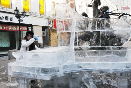 12月24日,一架冰钢琴在哈尔滨市中央大街步行街落成。据了解,这架冰钢琴是按照标准钢琴大小设计雕刻的。