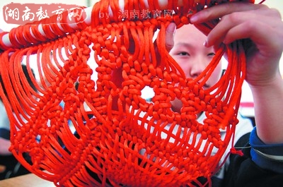 昨日下午,风帆广场上,一位双目失明的15岁女生正在用“心”编织壁挂。 贺文兵 摄