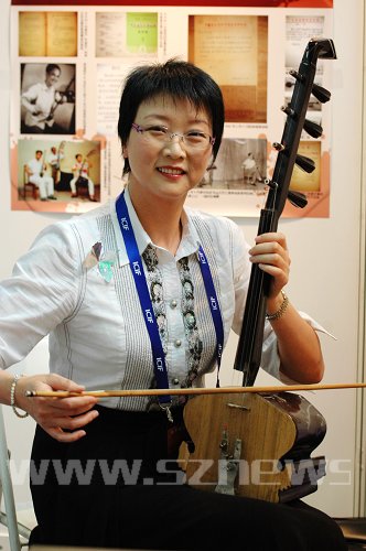 第四届文博会2号馆演艺产业馆可以说是“乐器的海洋”。走进该馆,你会看到各种各样的乐器:钢琴、二胡、小提琴、大提琴、架子鼓、长笛、萨克斯、长号、古筝……在这些传统乐器中,有一个新的乐器——全胡,尤其引人注目。