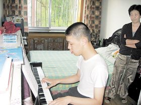 本报吉林讯(记者 曹文嘉) 在吉林市向阳街道华南社区有这样一个男孩,名叫黄鑫,1.81米的个头,脸很瘦,大大的眼睛,最难得的是弹了一手好琴,钢琴为八级优秀、电子琴为十级优秀。