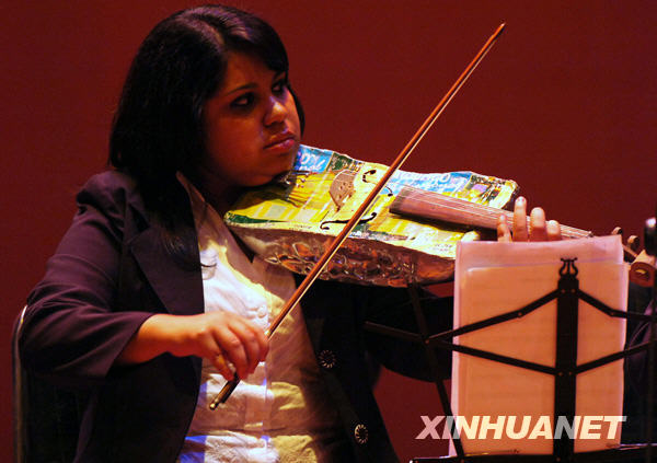巴拉圭的一支乐队当晚在亚松森城市剧院举行了一场别开生面的音乐会,他们使用的乐器都是用垃圾场淘来的垃圾制成的。