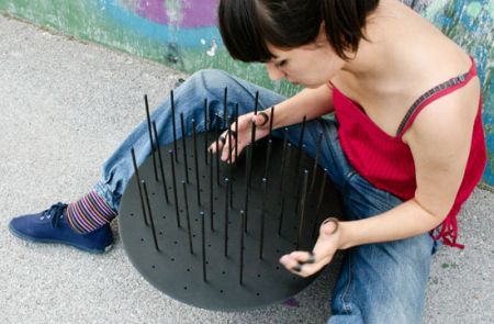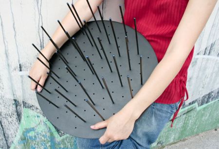这只蘑菇型物体形似被箭头插满的箭靶,它其实是一款弹拨乐器。蘑菇头里面藏有小钢珠,而靶面插上的箭头长短粗细不一,演奏者带上特制指套,通过拨动箭头,或者用指套敲击箭头就能发出不同的声响,以此演奏音乐。