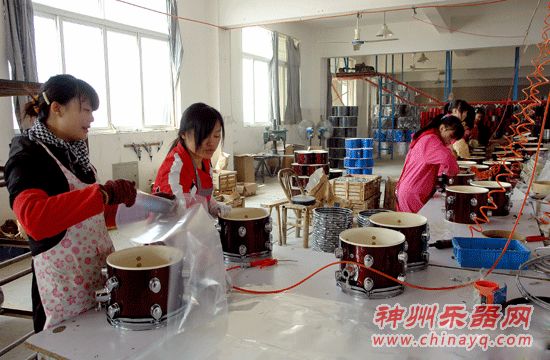 宁海弘鼎乐器有限公司是我县唯一一家专业从事爵士鼓乐器制造的企业。该企业自去年生产爵士鼓以来,生意就做到海外,今年1-10月份,销售额已达1000多万元,产品远销巴西、德国等20多个国家。由于受生产空间的限制,公司生产订单已排到2010年1月份。图为工人们正在忙碌生产的场景。