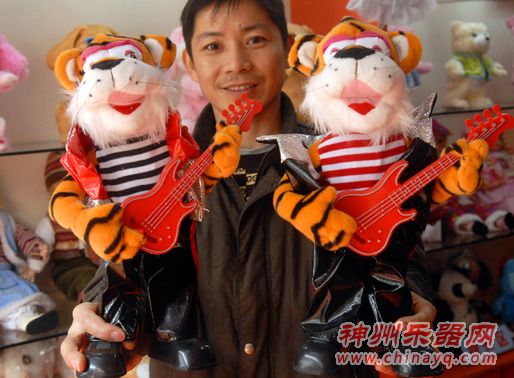 市区月河街区一家商铺,店主向顾客展示一款“杰克逊”造型的虎年饰品,“老虎”弹吉他。虎年将至,各种款式新颖的虎年饰品纷纷上柜,受到市民的欢迎。