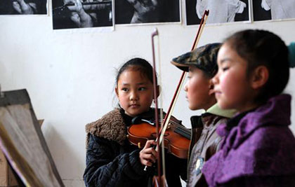 雍仲措手拿小提琴听课。