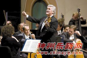 著名小提琴演奏家祖克曼在指挥交响乐团演出。