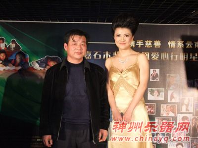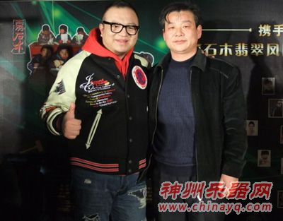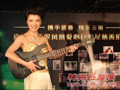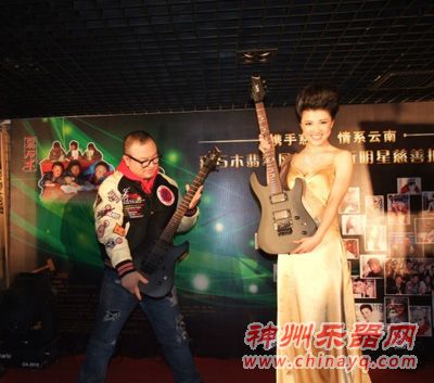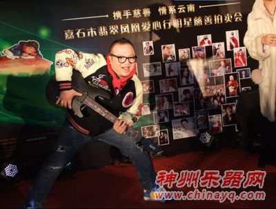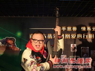 神州乐器网2010年1月11日讯:1月8日下午,“翡翠凤凰行-慈善拍卖会”如期举行。拍卖会上众星云集,成龙御用吉他手爱徒冀涛对雅特吉他情有独钟,现场与主持人苏炫烨争相拿着吉他“PK ”。
