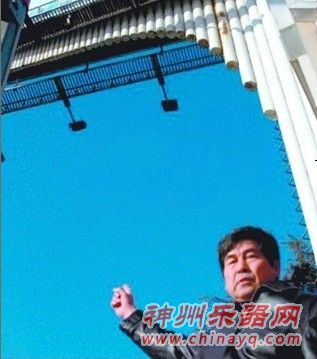 “这个高炮用锤子一敲,可以奏出有旋律的音乐。”王先生称,十年前凌晨两点钟的一个夜晚他驾驶大吊车将这个高炮竖立了起来,由于这个高炮造型很像排箫,突然他就冒出一个想法,“这个东西会不会像排箫一样奏乐呢?”于是他用小铁锤使劲的 敲了一下,结果就从这个大高炮的钢管中冒出来有节奏,而且旋律不同的音符,“寂静的晚上这个高炮冒出的音符声音特别大、 特别清晰,而且非常悦耳,我想制作这个高炮的工人当初也不一定知道这个高炮会奏乐,无意中制作了这么一个巨型乐器。”