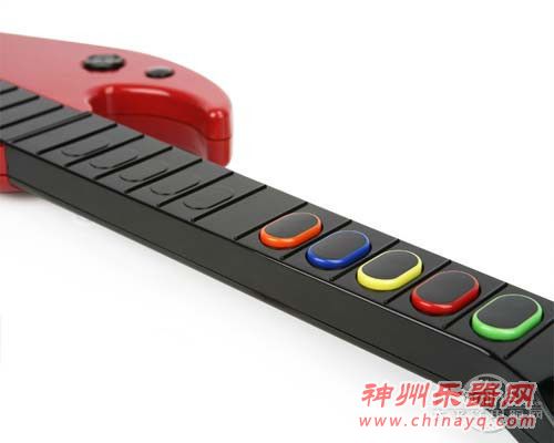 吉他黑色的琴把上,有两组定音按键。一组是传统的五彩游戏按键,另一组为隐形触感按键。两组按键让玩家随意选择,体验不一样的弹奏感。