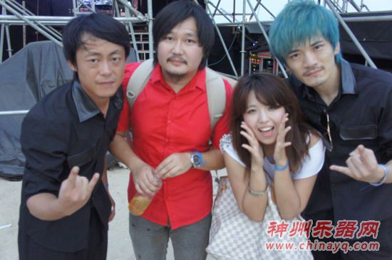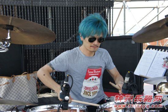 当天,乐队鼓手何岩为配合海豚音乐节的演出,特意把头发染成蓝色。一上场的他首先便向台下的乐迷热情打招呼。随后,头顶着蓝色发系伴着劲爆音乐演奏乐器,让现场音响震得轰鸣不已。随着晏新刚(小刚)身着红色上衣登场和陈磊一身黑色潮服站上台,两人一语不发的秀了把吉它技艺,这也让乐迷情绪根本无法控制,尖叫呐喊声不绝于耳。
