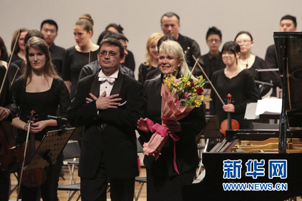 11月22日,北京国际室内交响乐团指挥玛丽亚·劳恩和钢琴演奏家德米特里在演出结束后向观众致意。