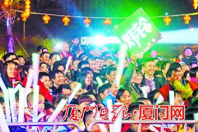 风景湖公园广场的舞台前响起了动感的摇滚旋律,早就等待在台前的男女老少挥舞着手中的荧光棒,迎来了这场花灯湖岸的新春音乐会。这次的演出可谓高大上。一开场就由2013年厦门好声音冠军李炜铃带来两首动感的英文歌曲,迅速将现场气氛引向高潮。