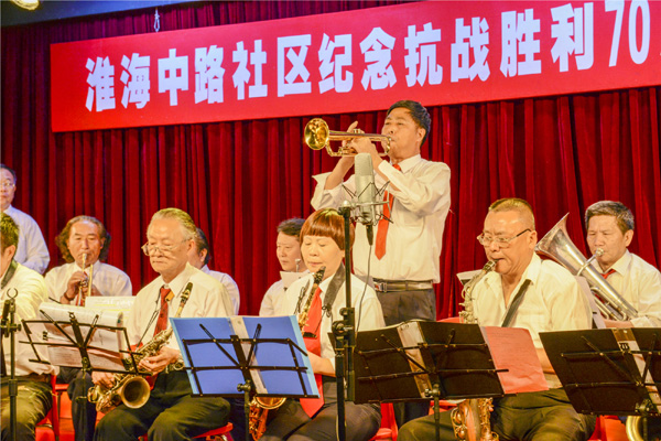 演出现场,淮海中路社区海韵管乐队用激昂的旋律、雄壮的乐曲,吹奏出《义勇军进行曲》、《大刀进行曲》、《喀秋莎》、《我爱你中国》等一首首脍炙人口的经典乐曲。一曲气势磅薄的《黄河颂》用不朽的音符表达了抗战时期中华儿女坚强不屈、英勇抗敌的崇高精神,把现场气氛带到了高潮。音乐会在《共筑中国梦》的合唱声中划上了圆满的句号。