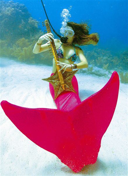 11日,一名穿美人鱼服装的女子抱着海星形状的吉他。