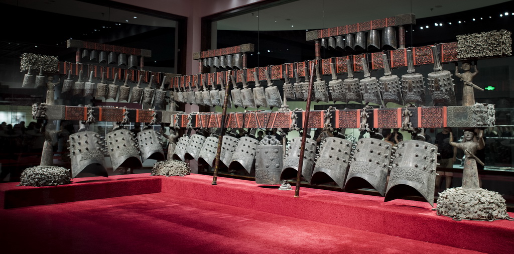 至今,曾侯乙编钟仍是中国出土数量最多、重量最重、音律最全、气势最为宏伟的一套编钟。其巍峨、完美的“曲悬”架式,与配套的曾侯乙编磬,完整、明确地呈现了周代诸侯的“轩悬”制度,并与其他青铜礼器一起交织出一幅近于现实的礼乐场景。