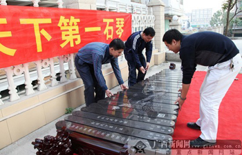 巨大石琴制作完成 石琴是广西柳江县出产的独有乐器,近日,一把已知为目前世上最大的石琴在柳江县成功制作完毕,这把柳江石琴将申请“天下第一石琴”的称号。