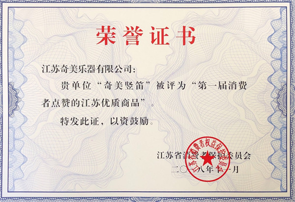 奇美公司作为竖笛行业标准主要起草单位,荣获第一届消费者点赞的江苏优质产品,促进了消费者对奇美公司竖笛等乐器产品的好品质、好口碑、好品牌有了更深的了解,提高了奇美品牌在优秀消费品牌市场的竞争力。(奇美公司)