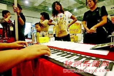 9日,在山东青岛国际会展中心,—种折叠式钢琴吸引了不少市民驻足观看。当日,第三届青岛工艺品家居品博览会在会展中心举行,一位商家正在展示折叠式硅胶钢琴。这款钢琴厚度不到1厘米,折叠起来可以放进书包内,拥有钢琴的出色音质,每台售价不到500元。