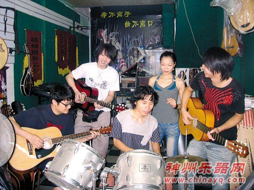 星期四下午,年轻人又如约相聚在琴行,在酒吧上班的梁程、胡寿裕来了,已为人母的28岁的吴苑芬来了,29岁的药品采购员郭鹏飞、梅州市人民医院医生徐泰都来了,你拿起吉他,我打爵士鼓,他弹贝司,琴行里又传出客家山歌的浓浓乡音……