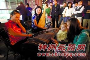 一对俄罗斯母女在看中国女孩弹古筝。昨日,双井桥东的乐成艺术广场开放。今后,这里在每个周末都会有免费表演,街头艺术家、杂耍艺人将与市民互动。