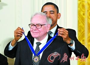 巴菲特无疑是商界的“杰出贡献者”。除提到这位“股神”的成功投资经历外,奥巴马还赞扬他在慈善领域所作的贡献。由于巴菲特平时的个人生活极为节俭,奥巴马在授勋时笑称送给他一条“白宫小领带”。
