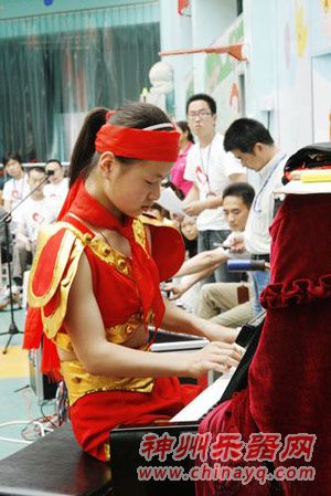 随后,刘蓓贝穿上了红色表演服,头上扎着红丝带,自信的走上舞台。她在钢琴前面坐下,不一会,欢快流畅的乐曲飘扬而出。