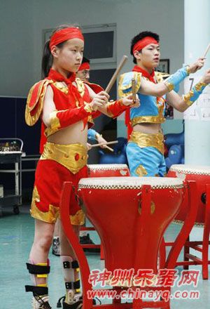 刘蓓贝在打鼓,脚上还戴着帮助站立的脚具。
