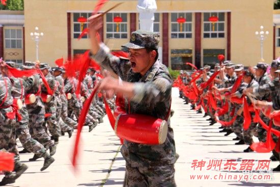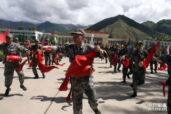 7月19日,驻藏某团近300名官兵踏着整齐的步伐,身穿迷彩服,扎着红腰带,背着红腰鼓,手拿红绸鼓槌,来到礼堂广场前,以豪迈雄壮的腰鼓表演热烈庆祝西藏和平解放60年。