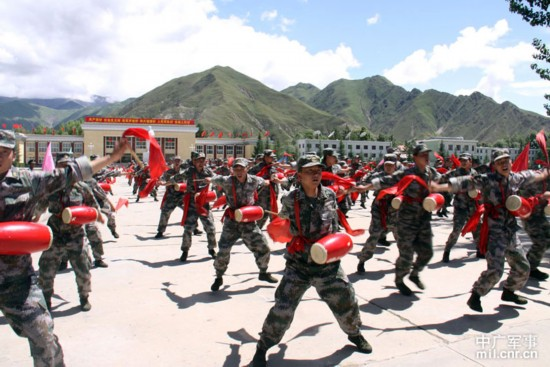 官兵们敲起腰鼓跳起舞,用激昂的鼓点、豪放的舞步,热情洋溢的表情表达对祖国大家庭的热爱,表达对西藏人民幸福生活的深深祝福,祝愿祖国更加繁荣昌盛,祝愿西藏明天更加美好,祝愿西藏人民的生活更幸福。