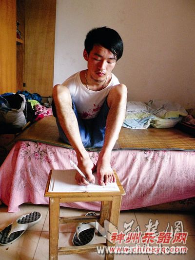 10年来,他学会用脚穿衣,梳头,写字,骑自行车,弹吉他;10年来,他多次在大赛上取得佳绩。在今年我省中职对口升学考试中(即中职高考),4门科目的满分是550分,他考了450分的好成绩。