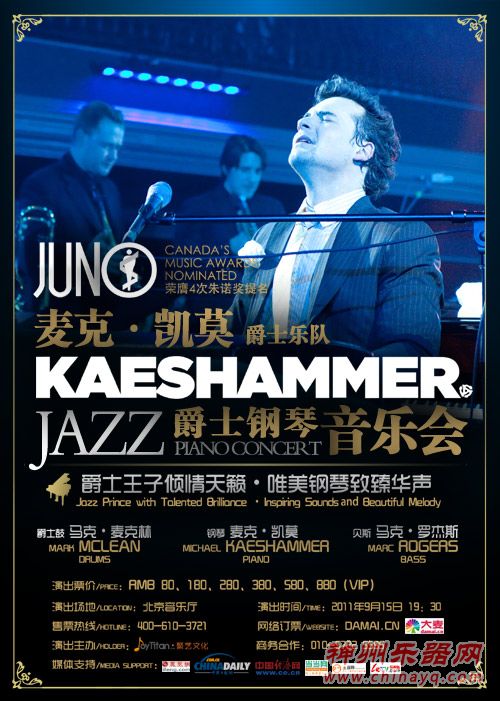 最后,音乐会的演出时间是2011年9月15号,在北京音乐厅。它的票价有880、580、380、280、180、80好多档,我已经给我和女友订了两张。爱好音乐的兄弟姐妹们,生活压力太大的城市青年们,想约会但不想去看俗电影的情侣们,我们一起去尝试爵士钢琴吧!