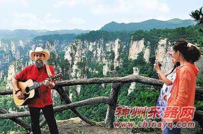 头戴一顶美国牛仔帽、蓄着一把极有个性的胡须、身着唐装手拿吉他8月9日,有着美国“当代乡村音乐之父”之称的马克·力文,在湖南张家界武陵源的美景中演奏起《东方红》、《浏阳河》等中国红歌,吸引不少游客驻足。在9月举行的张家界国际乡村音乐周上,马克·力文将再次代表一美国乐队献唱。