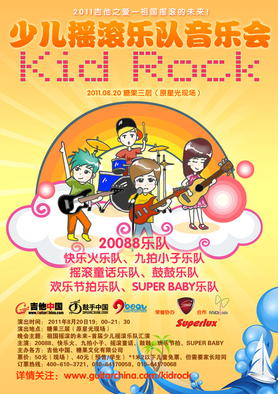 此次,少儿摇滚音乐会,20088乐队将携手自己的师弟师妹和其他小朋友们,奉献一场精彩的儿童摇滚乐队盛会!