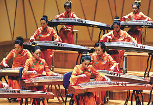 宁波爱菊艺术学校的古筝专场音乐在本市音乐厅演出中的一个镜头。