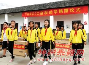 这10台电脑由市工会部门捐赠,钢琴由广陵区的企业家劳模捐赠。而曲江商品城的外地老板们也纷纷解囊,捐赠了价值1万多元的篮球、乒乓球、羽毛球、书包、笔记本等体育和学习用品。