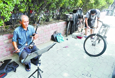 昨日中午,记者路过麟趾社区,远远便听到优美的二胡演奏,循着乐曲,一位师傅在路边的树阴下拉着二胡,一旁便是他的修车摊。