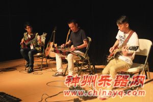 音乐会现场,潘文成(中)在表演少见的夏威夷吉他演奏
