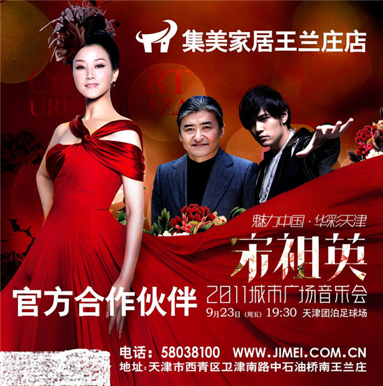 据悉,“魅力中国· 华彩天津——宋祖英2011城市广场音乐会”于9月23日19:30在天津团泊足球场震撼登场。本场音乐会由民歌天后宋祖英领衔众多国际顶级艺术家共同组成。